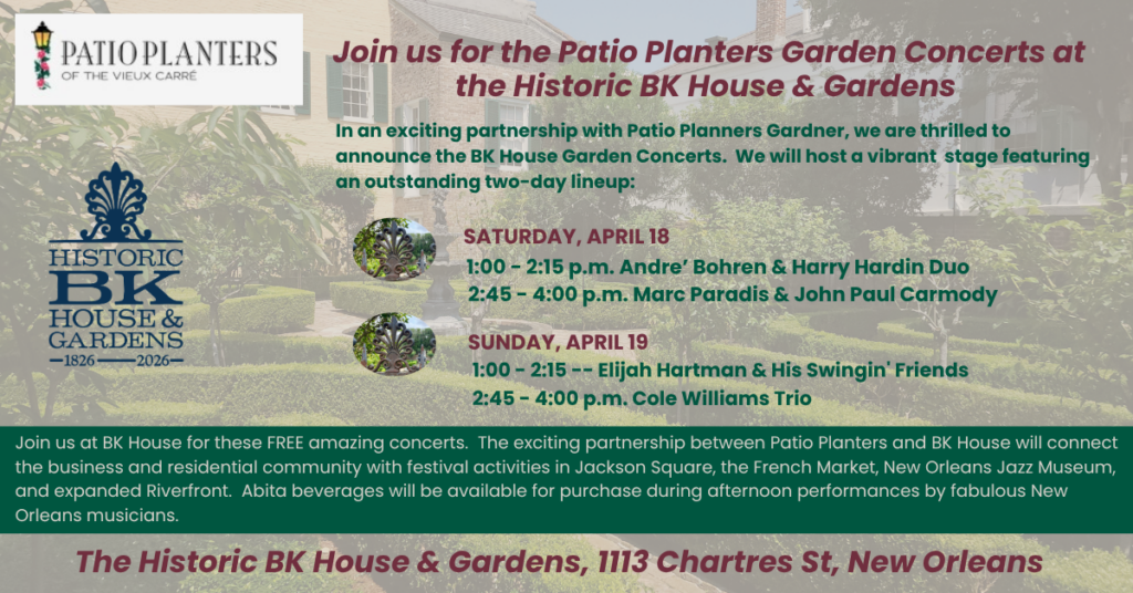 The Historic BK House & Gardens is a National Historic Landmark built in 1826. This architectural treasure is an outstanding example of a raised center hall villa and includes both Creole and American features in an elaborately detailed residence. BK House’s diverse history includes the stories of those who both lived and labored here for nearly 200 years, offering a unique educational experience to visitors, which furthers the understanding of New Orleans history. The house, parterre garden and lovely courtyard have been featured in several films and television shows and are favorites for guided tours, weddings, and special events.